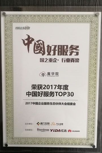 经过两三个月的品牌亮相、业务展示、海选点赞等等一系列环节,最终30家企业成功入选2017年度中国好服务,魔学院名列其中。这既是对魔学院过去服务的高度肯定,也是对未来我们为客户、为合作伙伴、为整个行业贡献更优质的服务提出的希望。