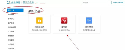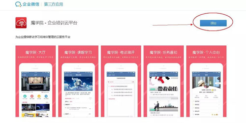 魔学院现已成为企业微信推荐应用,在企业微信官网的第三方应用首页即可找到我们,使用企业微信来办公的企业的管理员可以方便地添加使用,帮助您的企业快速搭建线上企业大学,对接培训资源。
