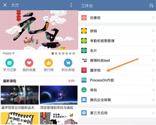 从此,员工通过企业微信工作台的“魔学院”入口即可进入魔学院学习课程、参加考试并与同事进行互动交流,培训与公司其他业务真正融合成有机整体,一个工作台无缝切换。