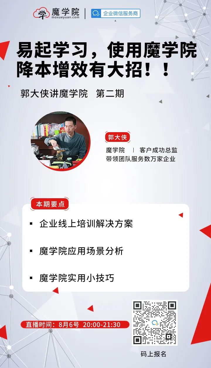 作为企业移动学习平台和服务一站式服务商,魔学院(www.moxueyuan.com)是国内新兴的企业培训云平台,以SaaS+移动互联+人工智能+开放平台技术为基础,打造无缝融入企业业务流程的移动学习平台,并整合课程、师资和代运营等增值服务,为企业和个人提供一体化培训解决方案。