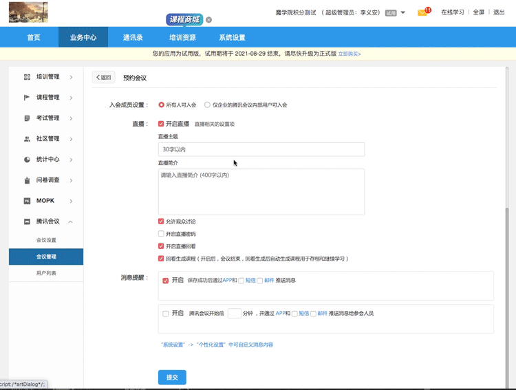 现在,这些统统都不用担心了!魔学院现在已经集成了腾讯会议,支持会议直播回放,并自动生成课程,同步到企业的课程中心,这样大大提高了管理员工作效率,组织远程会议、直播时,自动生成线上课程,节省了大量的时间。