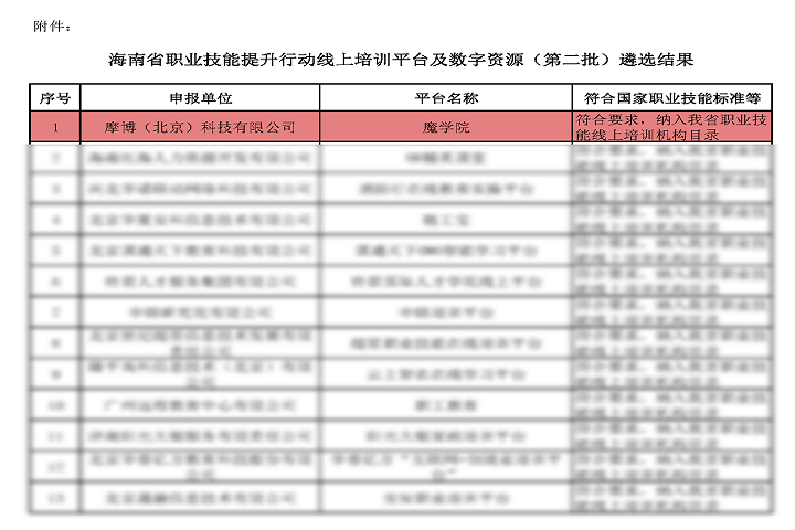经海南省就业局审议,魔学院平台成功入选海南省职业技能提升行动线上培训平台,正式承接海南省职业技能线上培训服务。 海南省自20年3月起,加大企业培训补贴的政策支持,对参加线上培训的企业员工,按照规定给予培训补贴。即日起,海南省企业在魔学院平台进行员工线上培训,可纳入职业培训补贴范围。