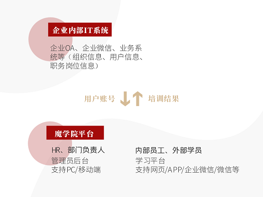 魔学院可以融入到各种企业业务流程和IT环境中,以联想为例,魔学院平台接入了联想零售,与其集成了零售家。除此之外,平台还可以直接接入企业微信、腾讯会议、各类HR系统、OA、CRM以及垂直行业SaaS系统等。