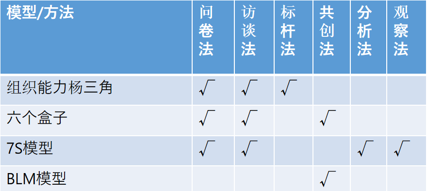 每个模型对方法是有要求的,组织能力杨三角模型主要是问卷法、访谈法、标杆法;六个盒子模型是问卷法和访谈法,但自从阿里巴巴引进来后,基本是采用共创法;7S模型是问卷法和访谈法居多,还有分析法;BLM模型采用的是共创法,其复杂程度比较大,基本是定战略的过程,从战略的管理角度去看待,其涉及到的问题有十几个方向。