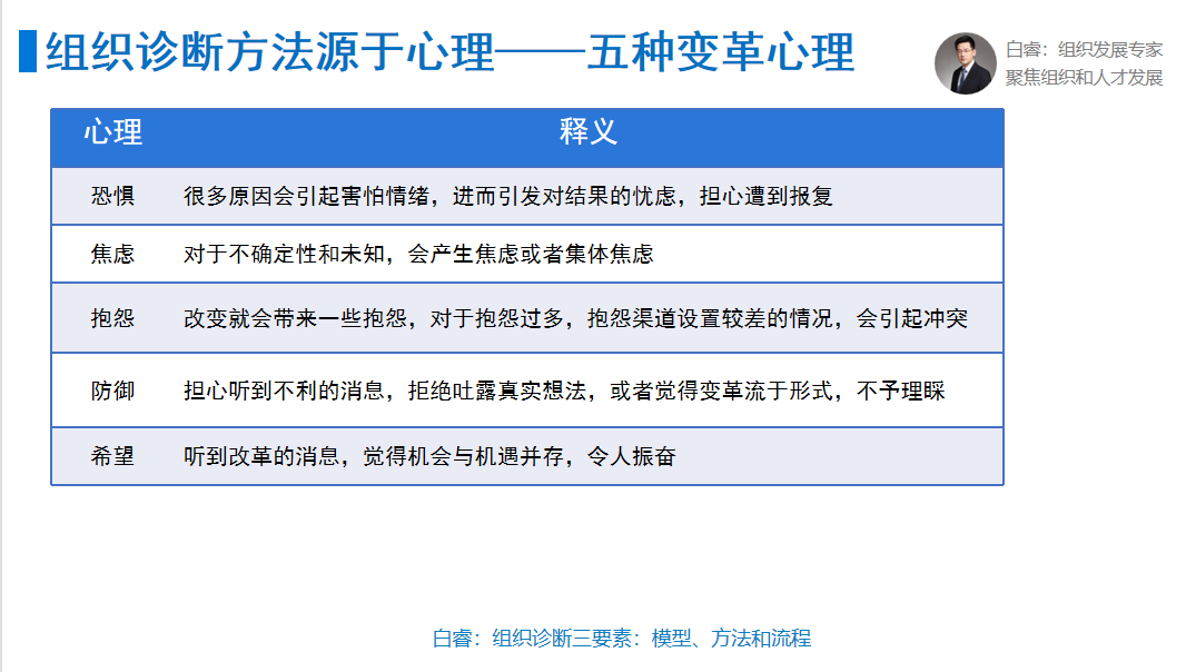 组织诊断方法源于心理,这叫群体心理。比如群体对变革产生了一种恐惧焦虑,我们采用个人访谈法会好一些;抱怨则采用集体吐槽的方式,像互联网公司的裸心会,抱怨挺多的,我们要直面这些问题;对于不想表达的群体可以采用匿名问卷等;对于积极的员工,把他们集合起来开共创会。针对于不同的群体心理,我们可以有不同的方法。
