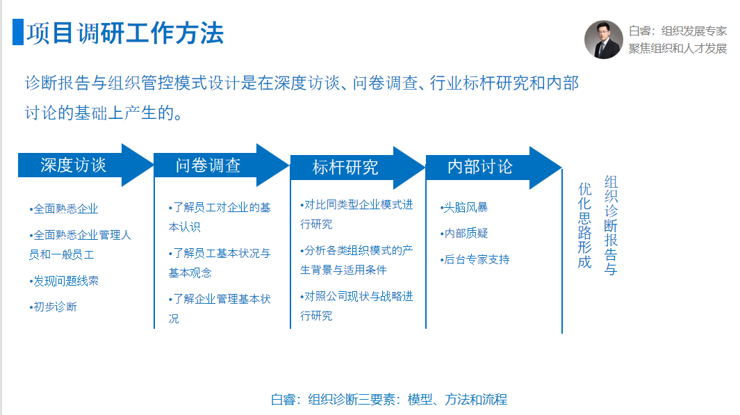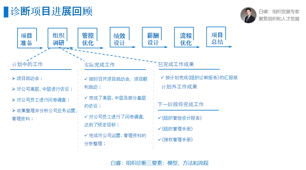 组织调研的过程是有计划性的工作,从小项目的启动会到进行问卷访谈,接着收集资料整理,最后形成一个组织诊断报告,为下一阶段做准备。
