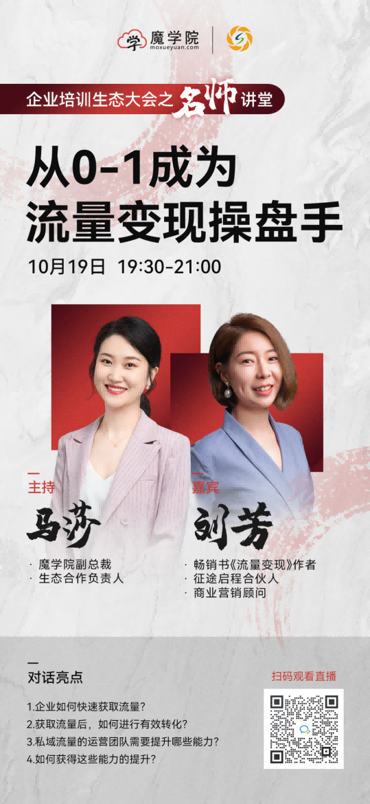 10月19日(周三)19:30,我们邀请到了畅销书《流量变现》的作者 刘芳与您共探「从0-1成为流量变现操盘手」,助您高效推进私域变现!