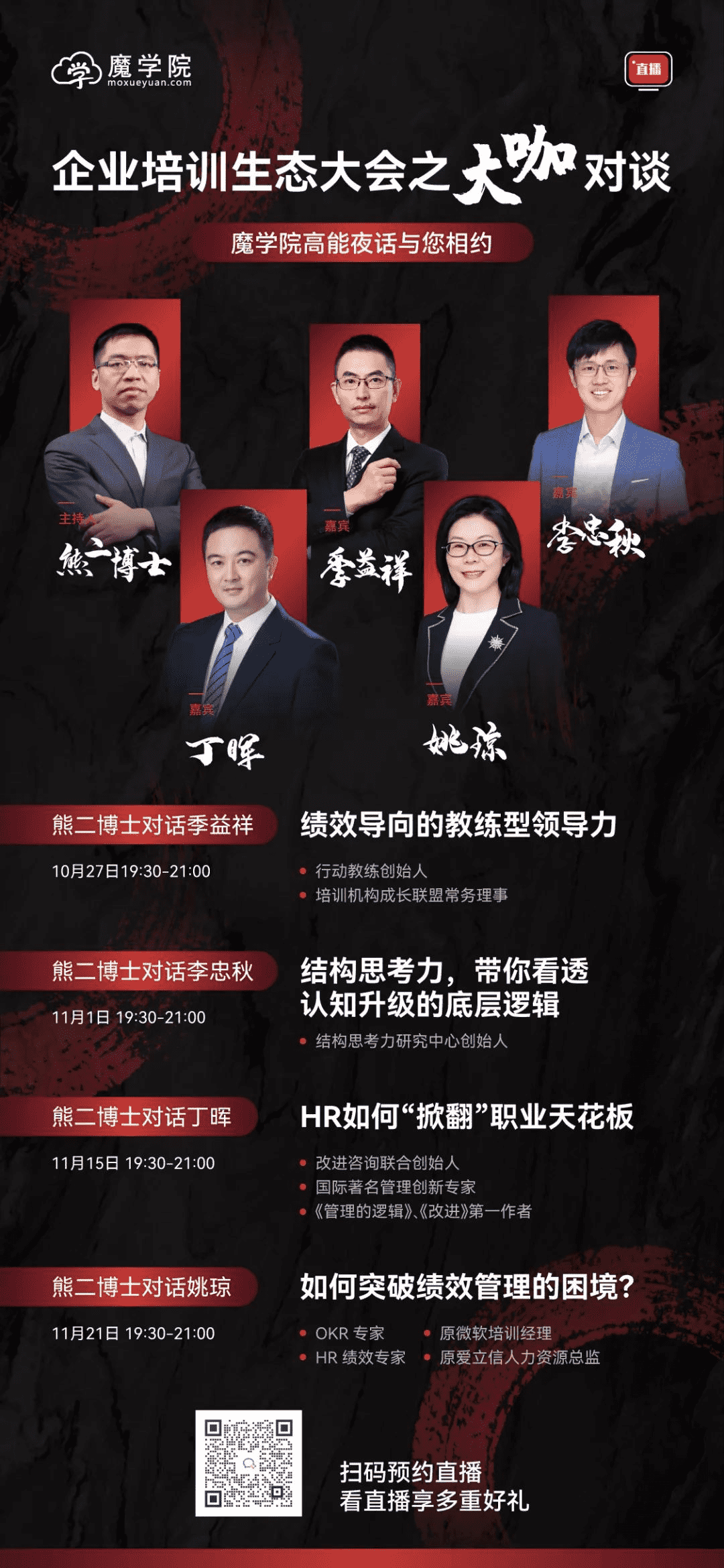 10月27日、11月1日、11月15日、11月21日 晚19:30-21:00,高能夜话直播重启,魔学院创始人熊二博士对话 行动教练创始人季益祥、结构思考力创始人李忠秋、改进咨询联合创始人丁晖、OKR专家姚琼4位大咖,带各位从目标管理、领导力、HR转型、认知提升四大维度,帮助各位HR伙伴突破职业瓶颈!