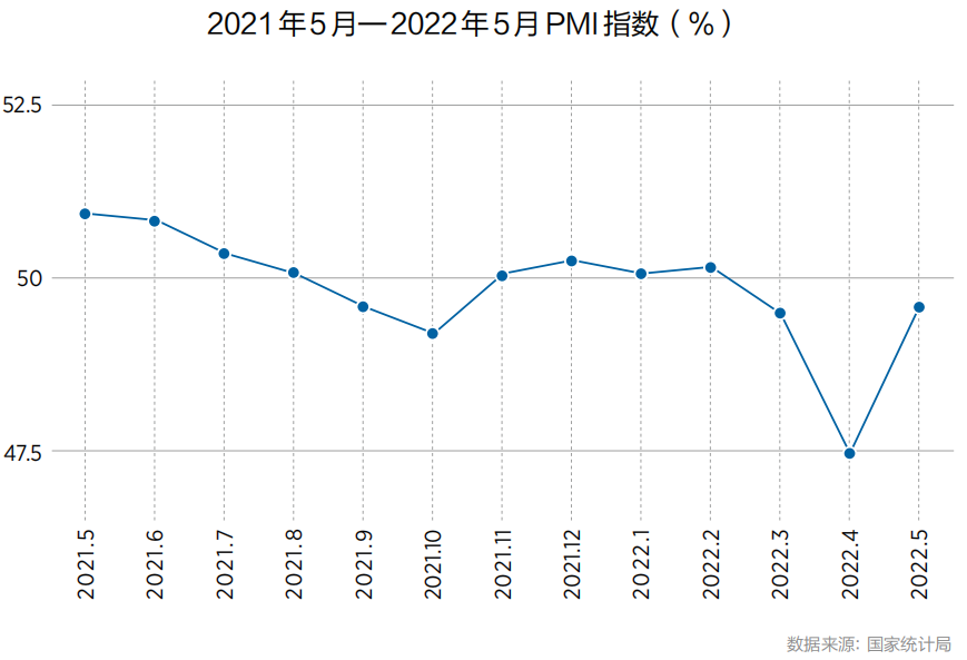 制造业采购经理指数(PMI)这一宏观经济的前瞻性指标也直观体现了这一困境。3—5月,PMI分别为49.5%、47.4%、49.6%,均在荣枯线以下。
